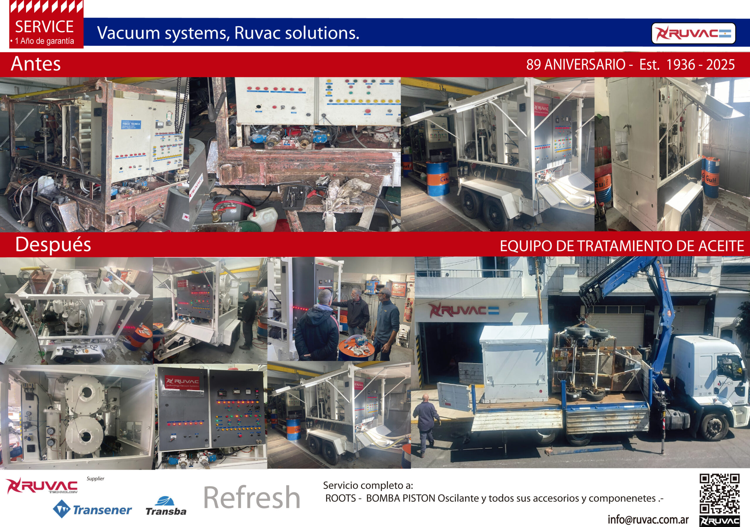 RUVAC Technology Vacuum Systems Presentamos el servicio refresh del equipo tratador de aceite. Reacondicionamiento del carro tratador, pintura total, tablero eléctrico, reemplazo